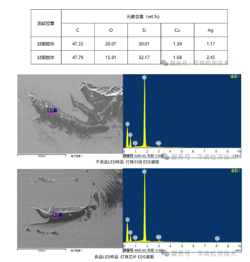 利用 EDS 技术对化学开封后的灯珠进行成分检测,包括引线、芯片和基板,未发现明显异常元素。进一步对机械剥离封装胶体后的基板残留封装胶体进行检测,结果显示不良品与良品的封装胶体成分未见明显差异。