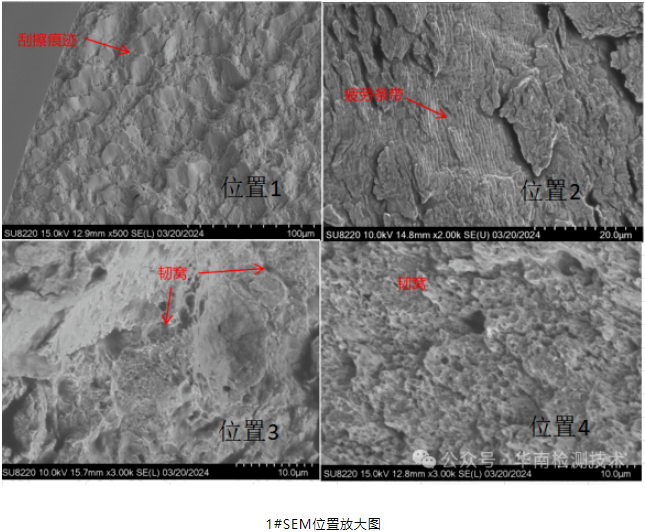 进一步的扫描电子显微镜(SEM)分析揭示了裂纹源区的刮擦痕迹,这是裂纹形成后在后续服役过程中受到摩擦的结果。在裂纹扩展区,我们观察到了明显的疲劳条带,而在最终断裂区,韧窝形貌表明了在断裂前发生了较大的塑性变形。