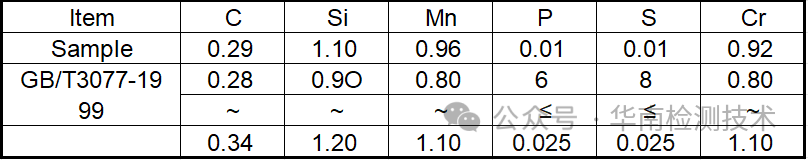 对断裂吊钩进行硬度检测,洛氏硬度值为 HRC38.2,HRC38.5,符合 HRC34-42 的委托要求。